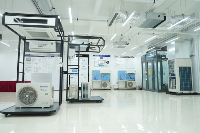Thông qua phòng thí nghiệm, sinh viên và giảng viên được tiếp cận, vận hành và nghiên cứu trên hệ thống không khí toàn diện, bao gồm điều hòa không khí, hệ thống thông gió, quạt, công nghệ lọc không khí và hệ thống giám sát chất lượng không khí CAMS. Đây là cơ hội để sinh viên quan sát toàn bộ chu trình vận hành thực tế của các giải pháp HVAC, từ nguyên lý làm lạnh của điều hòa dân dụng (RAC), đến khả năng tiết kiệm năng lượng vượt trội của hệ thống điều hòa thương mại VRF-FSV – dòng sản phẩm chủ lực của Panasonic.