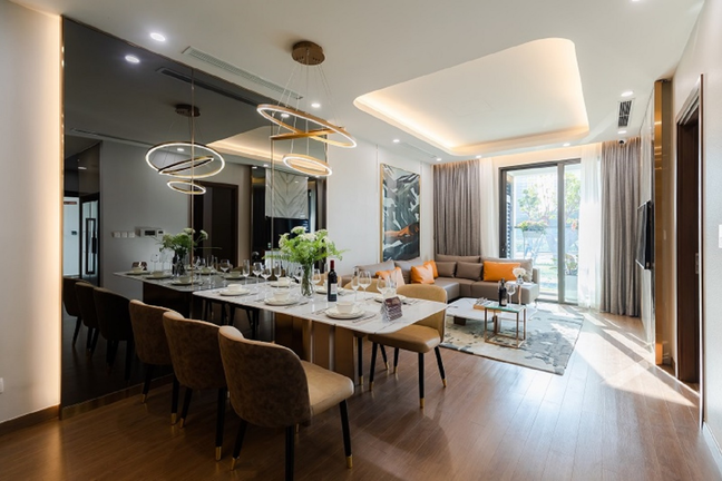 Phòng khách và phòng ăn được thiết kế liên thông, sở hữu không gian thoáng sáng khi kết nối trực tiếp với logia. Ánh sáng mang nguồn sinh khí mạnh mẽ vào bên trong căn hộ.