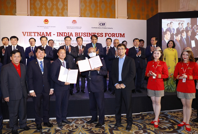 Đại diện Tập đoàn Sovico và Tập đoàn Tech Mahindra trao đổi thỏa thuận hợp tác trước sự chứng kiến của Chủ tịch Quốc hội Vương Đình Huệ, lãnh đạo cấp cao Việt Nam và Ấn Độ.