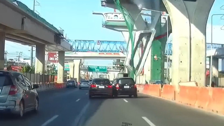 Tại đường Rama II (Bangkok, Thái Lan) một tấm bê tông rơi từ cầu vượt đang xây dựng xuống đường khiến các ô tô đánh lái tránh né.