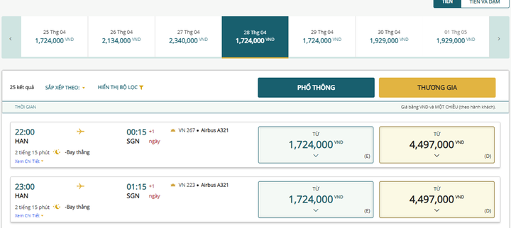 Giá vé Hà Nội - TP.HCM ngày 28/4/2024.