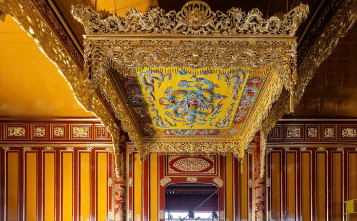 Bửu tán (tàng lọng quý báu) dùng để che trên ngai vàng của vua nhà Nguyễn đặt tại vị trí trung tâm của điện Thái Hoà trong Đại Nội Huế (nơi đăng quang của 13 vị vua nhà Nguyễn). (Ảnh: Nguyễn Phong)