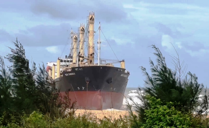 Tàu hàng New Energy bị sóng lớn đánh đứt neo, trôi dạt tới bờ biển thuộc địa phận Quảng Nam. (Ảnh: V.C)