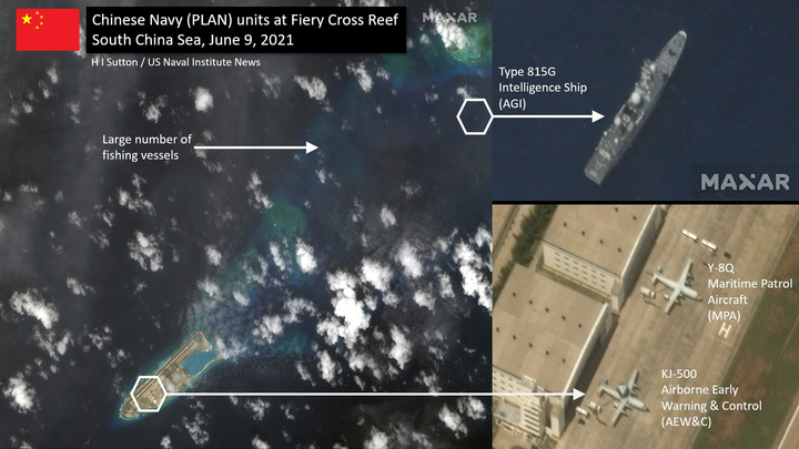 USNI, trang tin về hàng hải và an ninh quốc gia, phân tích hình ảnh vệ tinh của Maxar ngày 9/6, cho thấy một tàu thu thập thông tin tình báo Type-815G trong vùng đầm phá ở Đá Chữ Thập thuộc quần đảo Trường Sa của Việt Nam.