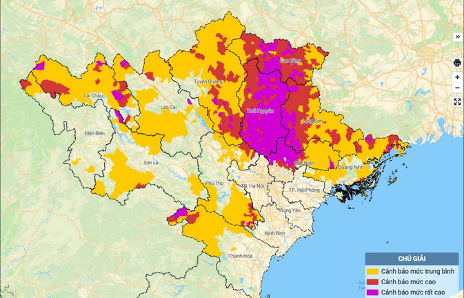 Theo bản đồ nguy cơ lũ quét, sạt lở đất đá trên các khu vực, nhiều nơi ở Thái Nguyên có mức cảnh báo rất cao - màu tím, khi mưa lớn liên tục trút xuống.