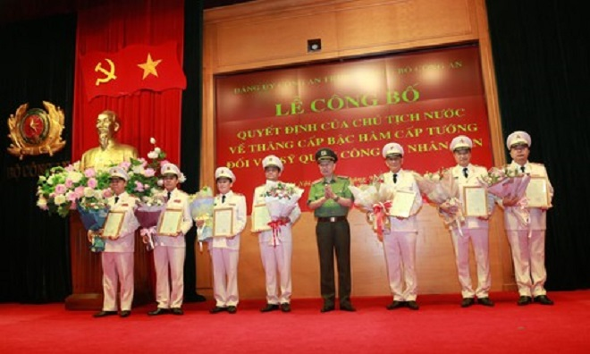 Thăng cấp bậc hàm từ Đại tá lên Thiếu tướng đối với 7 cán bộ, gồm: Nguyễn Văn Trung – Cục trưởng Cục Cảnh sát giao thông; Trần Phú Hà – Giám đốc Công an tỉnh Thanh Hóa; Phạm Ngọc Việt – Cục trưởng Cục An ninh nội địa; Lê Hồng Nam – Giám đốc Công an TP.HCM; Nguyễn Văn Viện – Cục trưởng Cục Cảnh sát điều tra tội phạm về ma túy; Võ Trọng Hải – Giám đốc Công an tỉnh Nghệ An; Trần Hải Quân – Tư lệnh Bộ Tư lệnh Cảnh vệ.