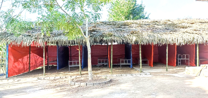 Hàng loạt lán tranh tre này được dựng trong khuôn viên của 2 nhà văn hóa thôn với 60 phòng, mỗi phòng rộng khoảng 5m2. Lán được dựng từ tre, luồng có sẵn trên các đồi, núi của xã, mái và tường xung quanh được lợp bằng lá cọ hoặc bạt. Bên trong các phòng được bố trí giường đơn, đèn điện và wifi miễn phí.
