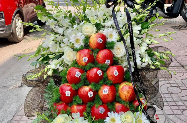 Dân mạng tranh cãi khi viếng đám ma bằng tháp táo đỏ. (Ảnh: FBNV)