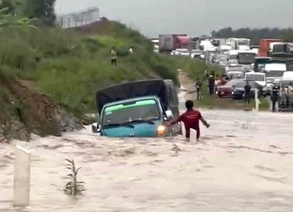 Cao tốc Phan Thiết - Dầu Giây bị ngập sâu khiến xe không lưu thông được (Ảnh: BBT).