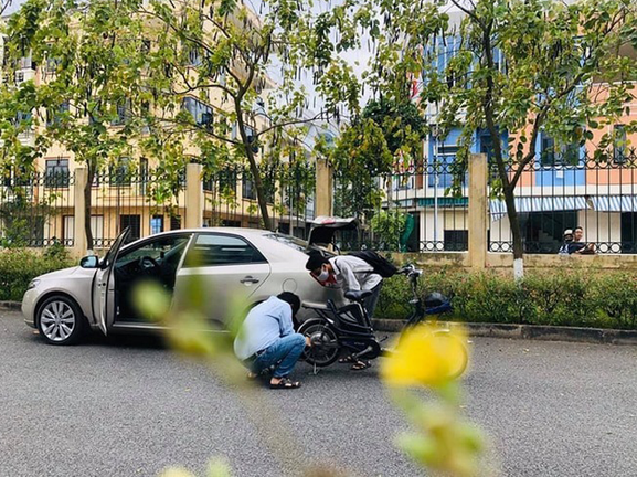 Thầy giáo bơm xe giúp học sinh giữa trưa nắng nóng.