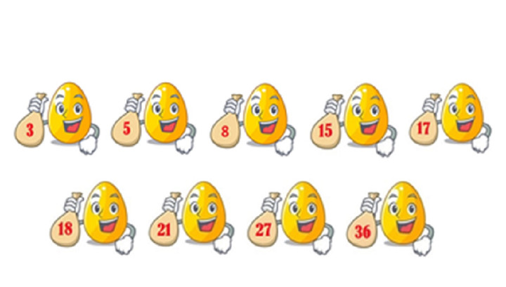 Chín chiếc túi lần lượt đựng 3, 5, 8, 15, 17, 18, 21, 27 và 36 quả trứng.