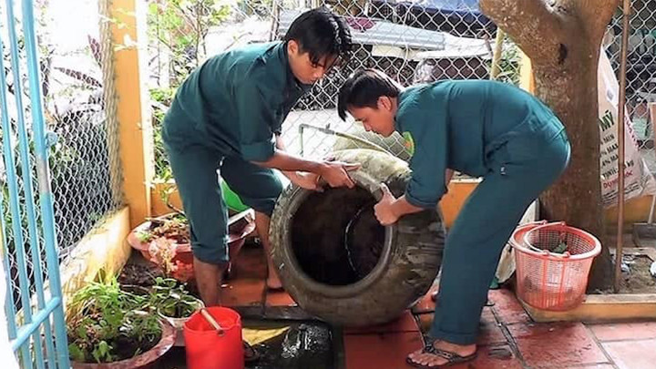 Đội xung kích diệt bọ gậy xã Tam Hiệp (Thanh Trì, Hà Nội) “đến từng ngõ, gõ từng nhà” hướng dẫn người dân về cách diệt bọ gậy, phòng chống sốt xuất huyết.