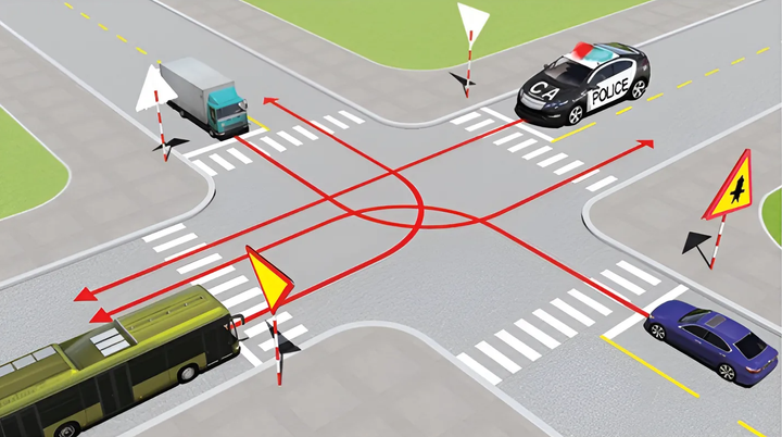 Thứ tự ưu tiên qua ngã tư: xe ưu tiên - đường ưu tiên - đường cùng cấp theo thứ tự bên phải trống - rẽ phải - đi thẳng - rẽ trái.