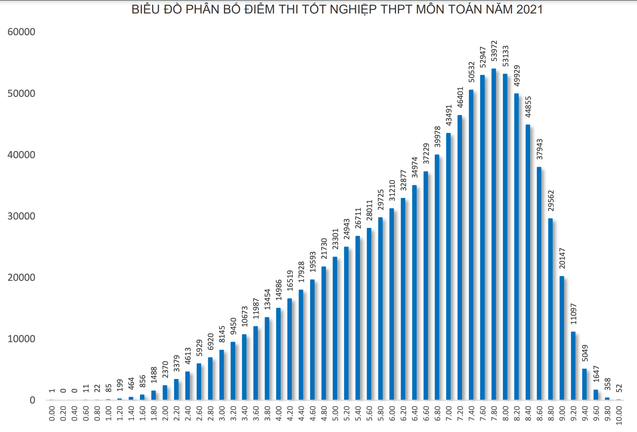 Kết quả phân tích phổ điểm thi tốt nghiệp THPT môn Toán năm 2021 cho thấy, cả nước có 980.876 thí sinh tham gia thi Toán, trong đó điểm trung bình là 6,61 điểm, điểm trung vị là 7,0 điểm. Điểm số nhiều thí sinh đạt nhất là 7,8 điểm. Số thí sinh điểm <= 1 là 119 (chiếm tỷ lệ 0,01%); số thí sinh đạt điểm dưới trung bình là 170.802 (chiếm tỷ lệ 17.41%).