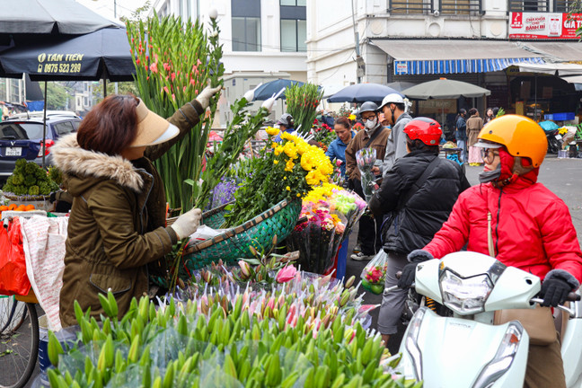 "Giá hoa cúc hôm nay tăng từ 25.000 lên 30.000 đồng/bó, hoa ly giá 350.000 đồng/bó, có thể đến Tết lên tới 380.000 - 400.000 đồng/bó, hoa hồng giá 8.000 - 10.000 đồng/bông, nói chung mỗi loại tăng lên một chút", một người bán hoa nói.