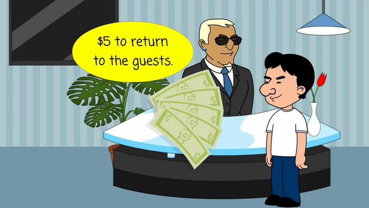 Ba chàng trai thuê một phòng khách sạn để nghỉ qua đêm. Khi đến khách sạn, họ trả 30 đô la tiền phí, sau đó đi lên phòng. Một lúc sau, nhân viên khách sạn mang đồ đạc của họ lên phòng và trả lại cho họ 5 đô la vì khách sạn có chương trình giảm giá đặc biệt vào cuối tuần. Vì vậy, 3 chàng trai quyết định mỗi người cầm 1 đô là và đưa cho nhân viên 2 đô la còn lại. Tuy nhiên, khi ngồi xuống kiểm kê lại số tiền, họ không thể giải thích được chi tiết sau: