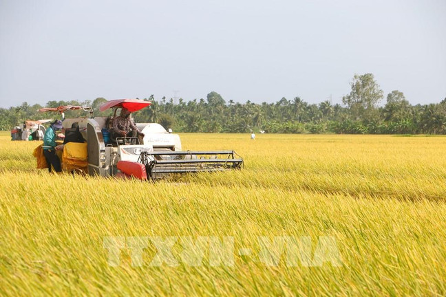 Nông dân Đồng bằng sông Cửu Long thu hoạch lúa Đông Xuân chính vụ. (Ảnh: TTXVN)