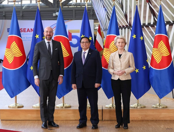 Chủ tịch Hội đồng châu Âu Charles Michel và Chủ tịch Ủy ban châu Âu Ursula Von der Leyen đón Thủ tướng Phạm Minh Chính tham dự Lễ khai mạc Hội nghị Cấp cao kỷ niệm 45 năm quan hệ ASEAN-EU.