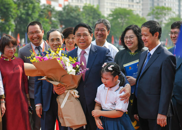 Thủ tướng Phạm Minh Chính nhận hoa chúc mừng của học sinh trường phổ thông Phenikaa.