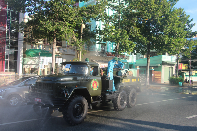 Tiểu đoàn Hóa học - Bộ tham mưu Quân khu 9 tổ chức phun xịt dung dịch khử khuẩn tại 55 tuyến đường giao thông, quốc lộ chủ yếu trên địa bàn TP Mỹ Tho. (Ảnh: Chu Huy)