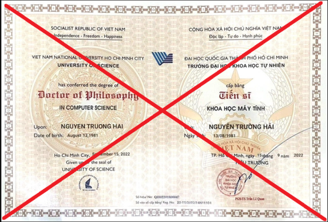 Nắm bắt xu hướng ngành hot đang thiếu giảng viên, bằng tiến sĩ giả của ông Hải ghi ngành Khoa học máy tính, Trường ĐH Khoa học Tự nhiên, ĐH Quốc gia TP.HCM. Nhưng thực tế, Trường ĐH Khoa học Tự nhiên, ĐH Quốc gia TP.HCM không cấp văn bằng này cho ông Hải. Ông Hải cũng không là nghiên cứu sinh của trường này.