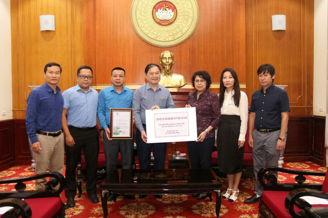 Phó Chủ tịch Ủy ban Trung ương Mặt trận Tổ quốc Việt Nam Tô Thị Bích Châu tiếp nhận ủng hộ từ Liên hiệp các Hội Khoa học và Kỹ thuật Việt Nam. (Ảnh: mattran.org.vn)