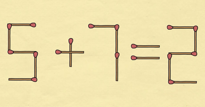 Chỉ di chuyển 1 que diêm, người chơi hãy biến phép tính 5 + 7 = 2 thành đúng theo 3 cách khác nhau.