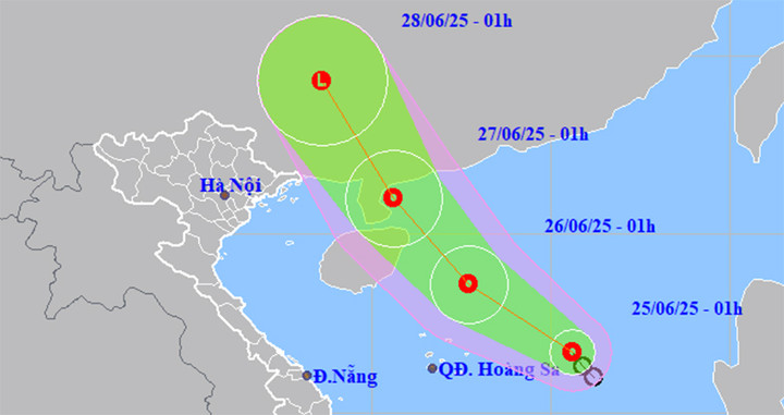 Lúc 1h ngày 25/6, vị trí tâm áp thấp nhiệt đới cách quần đảo Hoàng Sa khoảng 440km về phía Đông. Sức gió mạnh nhất vùng gần tâm áp thấp nhiệt đới mạnh cấp 6 (39-49km/h), giật cấp 8, di chuyển theo hướng Tây Bắc với tốc độ khoảng 15km/h. Áp thấp nhiệt đới ít khả năng mạnh lên thành bão.