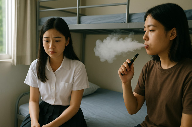 Nhập viện vào tháng 8 trong tình trạng yếu nửa người, nói khó và thay đổi tính tình, nữ sinh 16 tuổi được đưa đến Khoa Hồi sức cấp cứu, Bệnh viện Đa khoa Hòa Bình (Phú Thọ). Gia đình khẳng định em không sử dụng chất độc hại, không hút thuốc. Tuy nhiên, khai thác bệnh sử cho thấy em ở ký túc xá, thường xuyên hít phải khói thuốc lá điện tử từ bạn cùng phòng. Kết quả cộng hưởng từ ghi nhận tổn thương não do nhiễm độc hóa chất từ khí aerosol vape.