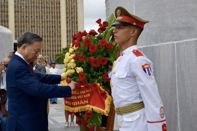 Tổng Bí thư, Chủ tịch nước Tô Lâm và Phu nhân cùng Đoàn đại biểu cấp cao Việt Nam đặt hoa tại Đài tưởng niệm Anh hùng dân tộc Cuba Jose Marti ở thủ đô La Habana.