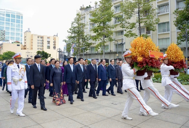 Chào mừng kỷ niệm 50 năm Ngày Giải phóng miền Nam, thống nhất đất nước (30/4/1975 - 30/4/2025), chiều nay tại TP.HCM, Đoàn đại biểu Ban Chấp hành Trung ương Đảng, Chủ tịch nước, Quốc hội, Chính phủ, Ủy ban Trung ương Mặt trận Tổ quốc Việt Nam do Tổng Bí thư Tô Lâm làm Trưởng đoàn đã đến dâng hoa, dâng hương tưởng nhớ Chủ tịch Hồ Chí Minh tại Bảo tàng Hồ Chí Minh - Chi nhánh TP.HCM và tại Công viên Tượng đài Chủ tịch Hồ Chí Minh; dâng hoa, dâng hương tưởng nhớ Chủ tịch Tôn Đức Thắng tại Bảo tàng Tôn Đức Thắng.