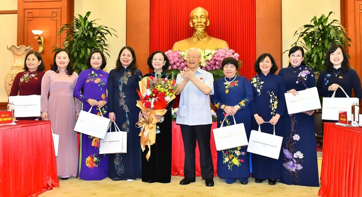 Nói chuyện thân mật với các nữ Đại biểu Quốc hội, Tổng Bí thư Nguyễn Phú Trọng bày tỏ vui mừng và tự hào được chứng kiến sau mỗi lần gặp mặt, đội ngũ nữ đại biểu Quốc hội đều có bước phát triển mới, tích cực hơn, đúng như Chủ tịch Hồ Chí Minh muôn vàn kính yêu khẳng định: "Non sông gấm vóc Việt Nam do phụ nữ ta, trẻ cũng như già, ra sức dệt thêu mà thêm tốt đẹp, rực rỡ". Và với sự đóng góp to lớn của phụ nữ Việt Nam, Bác Hồ đã tặng phụ nữ 8 chữ vàng "Anh hùng - Bất khuất - Trung hậu - Đảm đang".