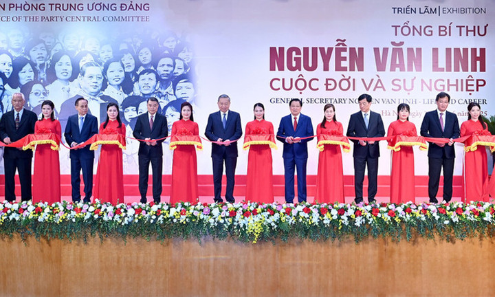 Tổng Bí thư Tô Lâm và các đại biểu cắt băng khai mạc triển lãm "Tổng Bí thư Nguyễn Văn Linh - Cuộc đời và sự nghiệp".