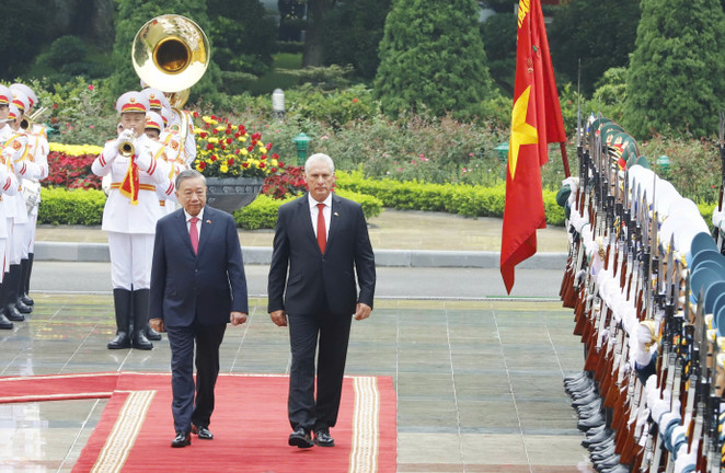 Tổng Bí thư Tô Lâm và Bí thư thứ nhất Ban Chấp hành Trung ương Đảng Cộng sản Cuba, Chủ tịch nước Cộng hòa Cuba Miguel Díaz-Canel Bermúdez duyệt đội danh dự Quân đội Nhân dân Việt Nam.