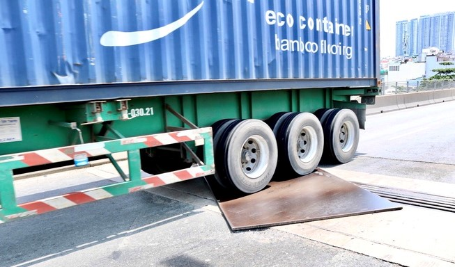 Ghi nhận của phóng viên chiều 10/9, hàng loạt xe container và xe tải nặng đi qua đây khiến tấm thép đặt tạm bị xô lệch, rung bật. Trong khi đó, một số ô tô con phải thắng gấp khi gần đến đoạn này để tránh vướng tấm thép.