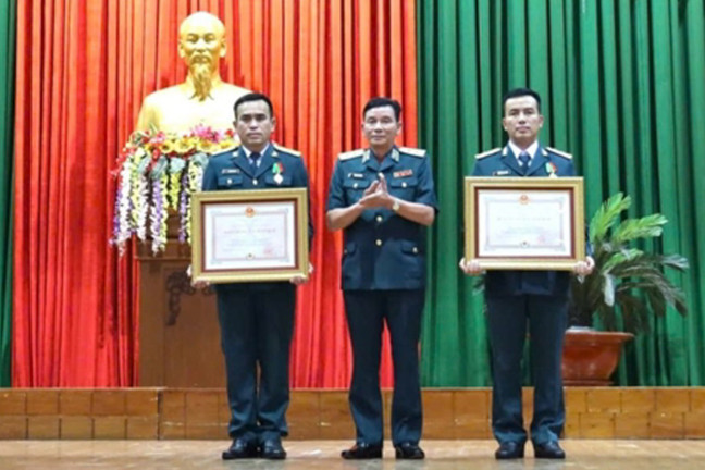 Thừa ủy quyền của Chủ tịch nước, Trung tướng Trần Ngọc Quyến trao Huân chương Bảo vệ Tổ quốc hạng ba tặng hai phi công.