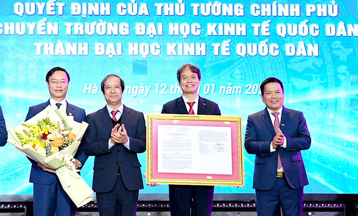 Sáng 12/1, Bộ trưởng GD&ĐT Nguyễn Kim Sơn trao quyết định của Thủ tướng chuyển trường Đại học Kinh tế quốc dân thành Đại học Kinh tế quốc dân.