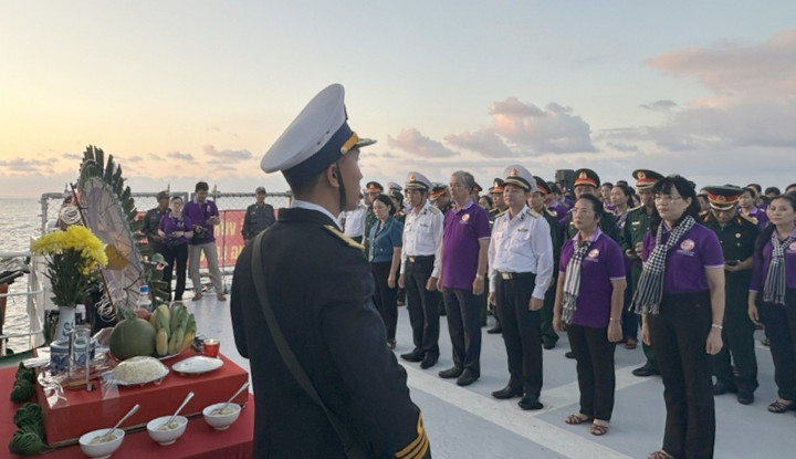 Giờ phút thiêng liêng, giữa trùng khơi, với niềm tiếc thương vô hạn, các đại biểu kính cẩn nghiêng mình ghi nhớ công ơn và tưởng nhớ các anh hùng liệt sĩ Trường Sa.