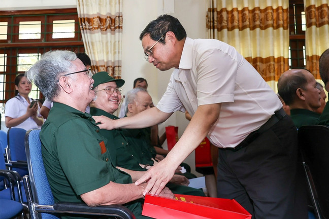 Thủ tướng Phạm Minh Chính tặng quà các thương binh, bệnh binh nặng hạng đặc biệt tại Trung tâm điều dưỡng thương binh Kim Bảng, Hà Nam. (Ảnh: VGP)