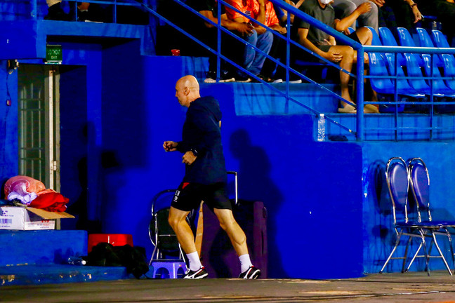 HLV Luis Viegas bỏ chạy vào phòng thay đồ.