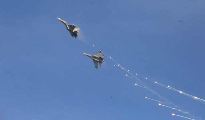 Trực thăng kéo cờ, tiêm kích Su30-MK2 thả bẫy nhiệt trên bầu trời TP.HCM