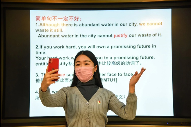 Giáo viên đang ghi lại bài dạy trong một lớp học cấp 2 ở Thiệu Dương, Hồ Nam, Trung Quốc (Ảnh: China Daily/ Reuters)