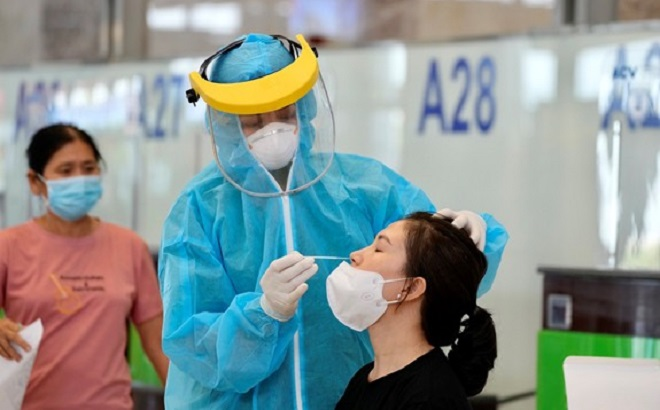Nhân viên y tế lấy mẫu xét nghiệm COVID-19 cho hành khách tại Cảng Hàng không quốc tế Nội Bài. (Ảnh: NIA)