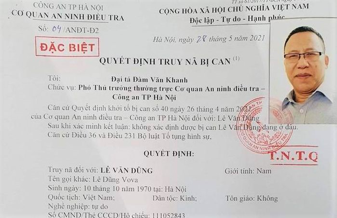 Mới đây, Đại tá Đàm Văn Khanh – Phó Thủ trưởng thường trực Cơ quan ANĐT Công an TP Hà Nội ký quyết định truy nã đối với bị can Lê Văn Dũng (Lê Dũng 'Vova') với tội danh “Làm, tàng trữ, phát tán hoặc tuyên truyền thông tin, tài liệu, vật phẩm nhằm chống Nhà nước Cộng hòa xã hội chủ nghĩa Việt Nam” theo quy định tại Điều 117, Bộ luật Hình sự.