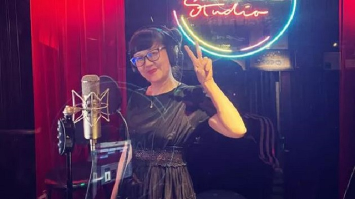 Diễn viên Vân Dung trong phòng thu.