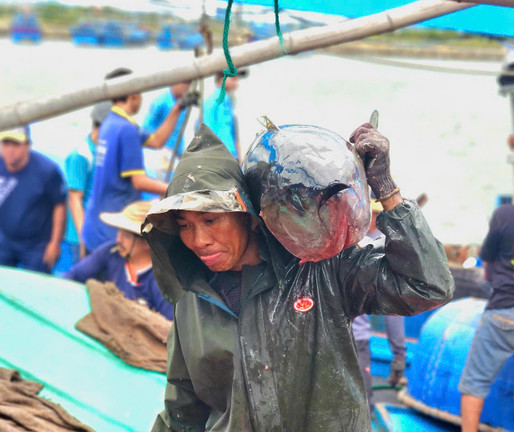 Trung bình mỗi con cá ngừ nặng 35-50 kg, có con nặng trên 65 kg. Giá bán cho thương lái mua tại cảng là 100.000 đồng/kg.