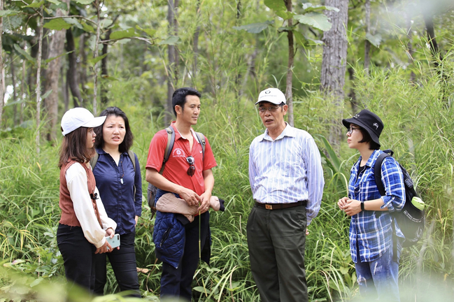 Tiến sĩ Ngô Tiến Dũng (thứ 4 từ trái qua) chia sẻ về những loài động thực vật trong rừng.