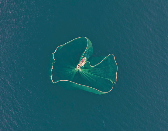 Dưới bàn tay thoăn thoắt thạo nghề của ngư dân, dáng lưới biến thiên liên tục, lúc tựa như một trái tim khổng lồ giữa lòng biển cả.