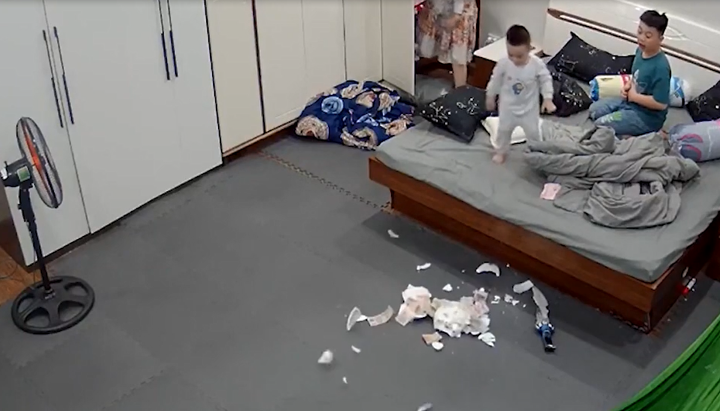 Vẻ mặt bàng hoàng của cậu bé khi em trai ném vỡ heo đất
