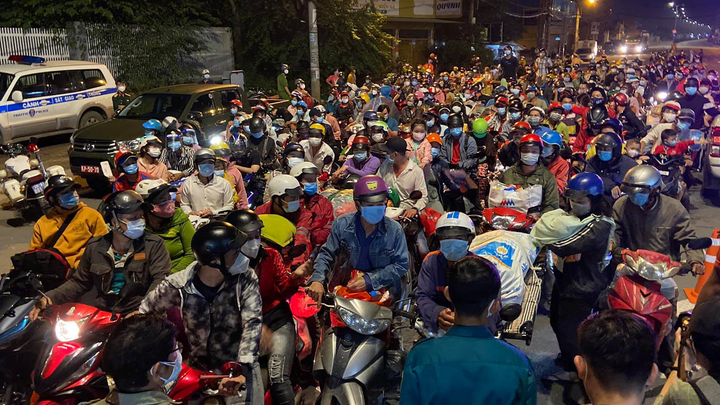 Tối 30/9, tại quốc lộ 1A, thị trấn Tân Túc (Bình Chánh, TP.HCM) hàng trăm người dân chở nhau trên xe máy về quê và kẹt lại tại chốt kiểm soát.